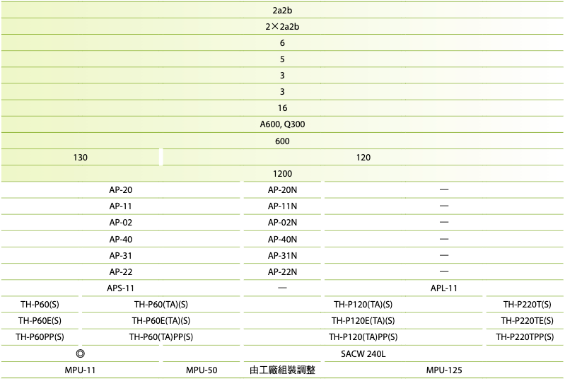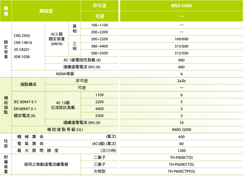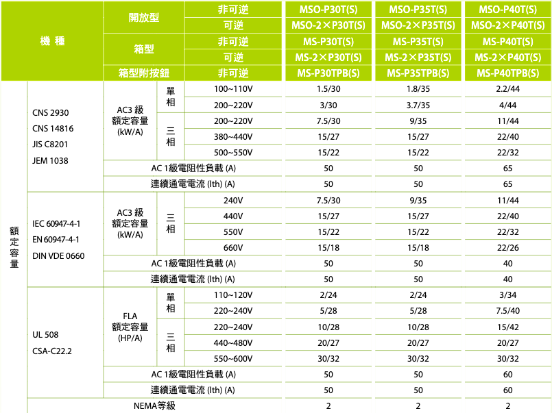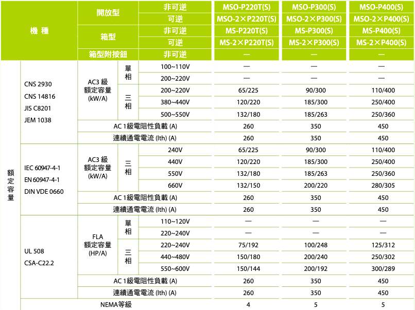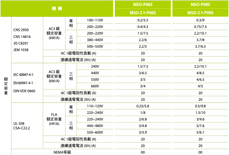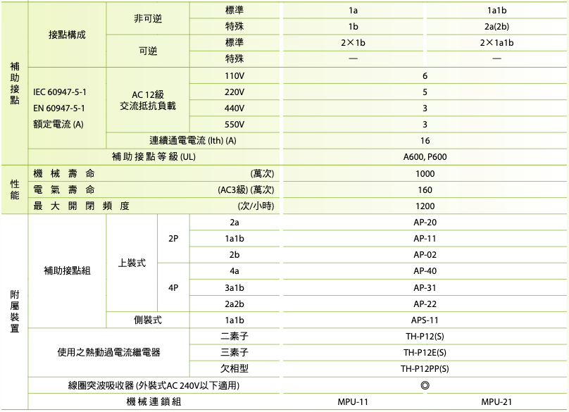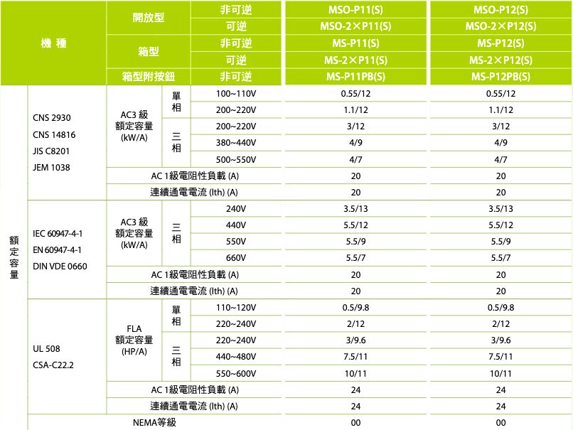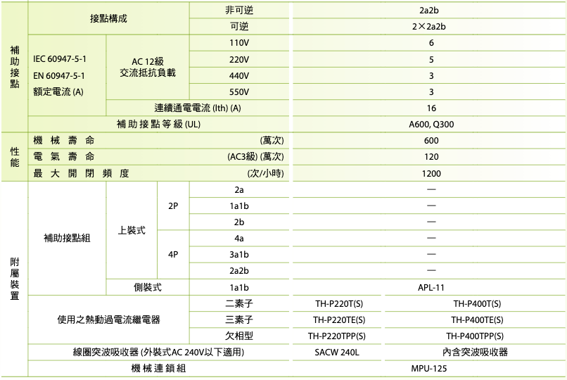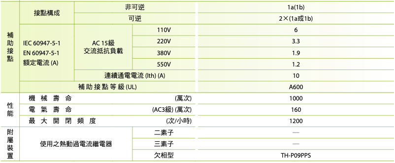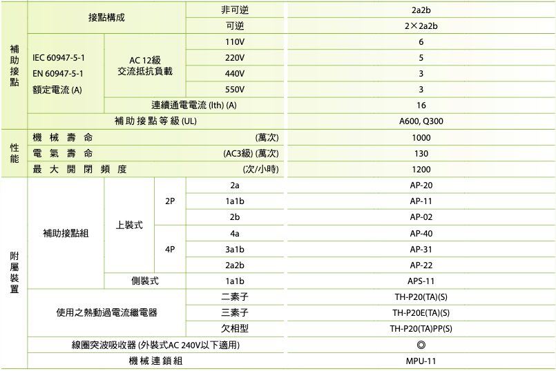 註:熱動過電流繼電器之電流值,請依接觸器搭配實際負載之額定電流選用。
