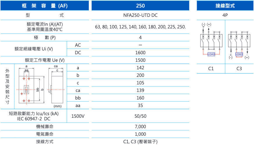 - 功能:NFA DC型直流斷路器,能夠實現直流配電應用環境中電流的導通、承載、啟斷和保護,具有過載保護和短路保護功能,可作隔離之用。