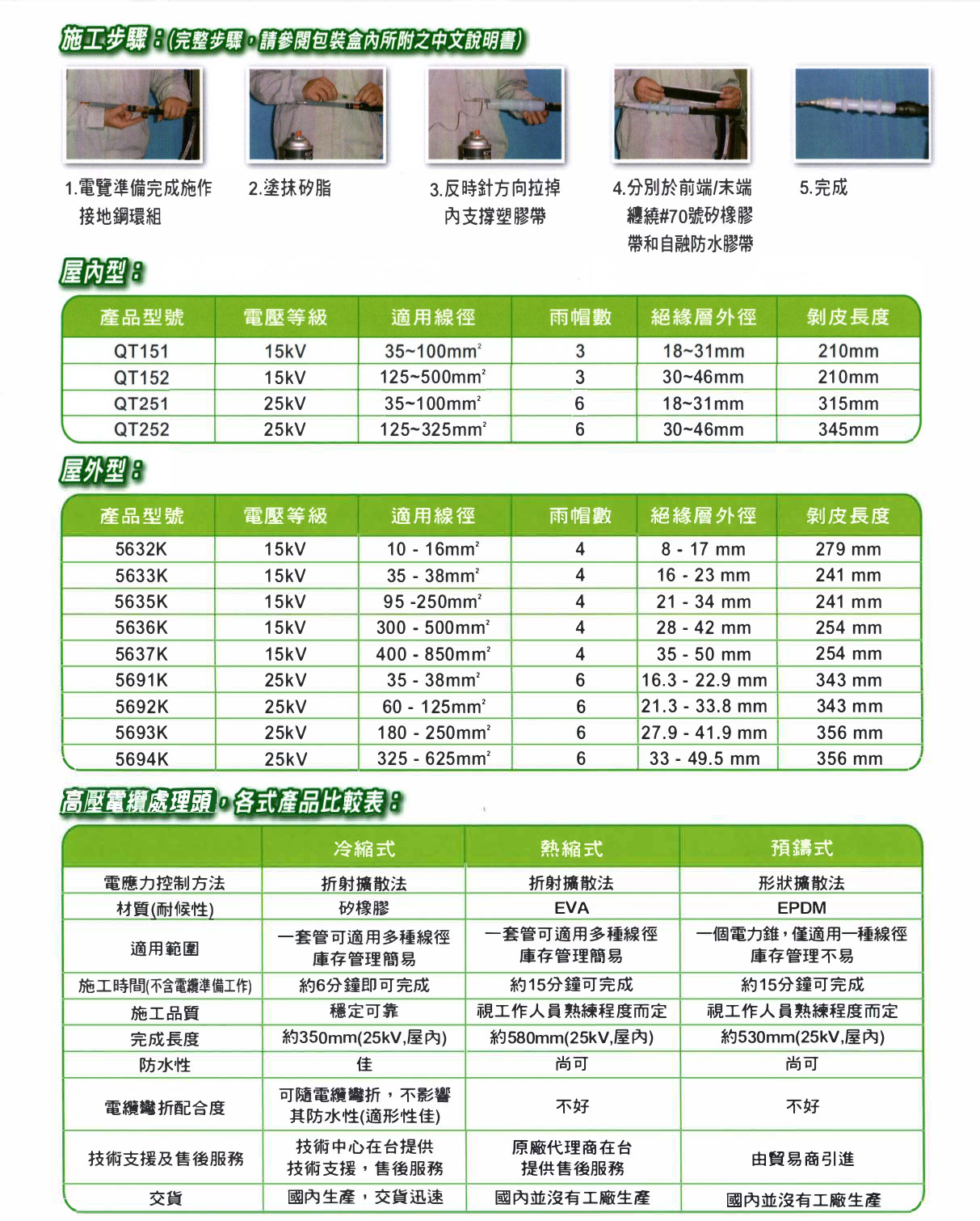 全新三雨帽設計(15kV級),增長爬電距離:大幅縮短電纜剝除長度。*超短型設計,節省施工時間,同時確保施工品質,安全丶可靠丶輕鬆丶愉快。
